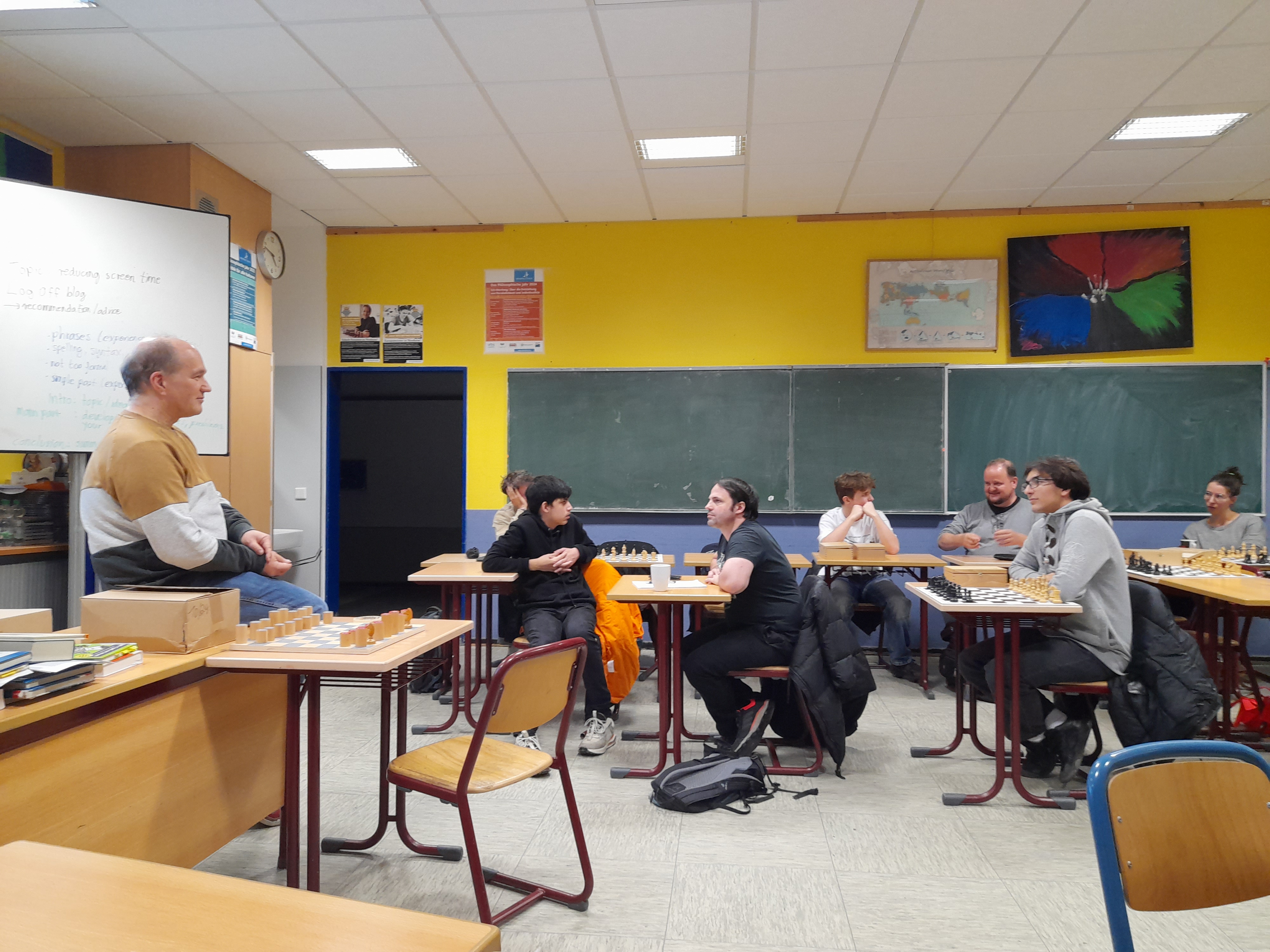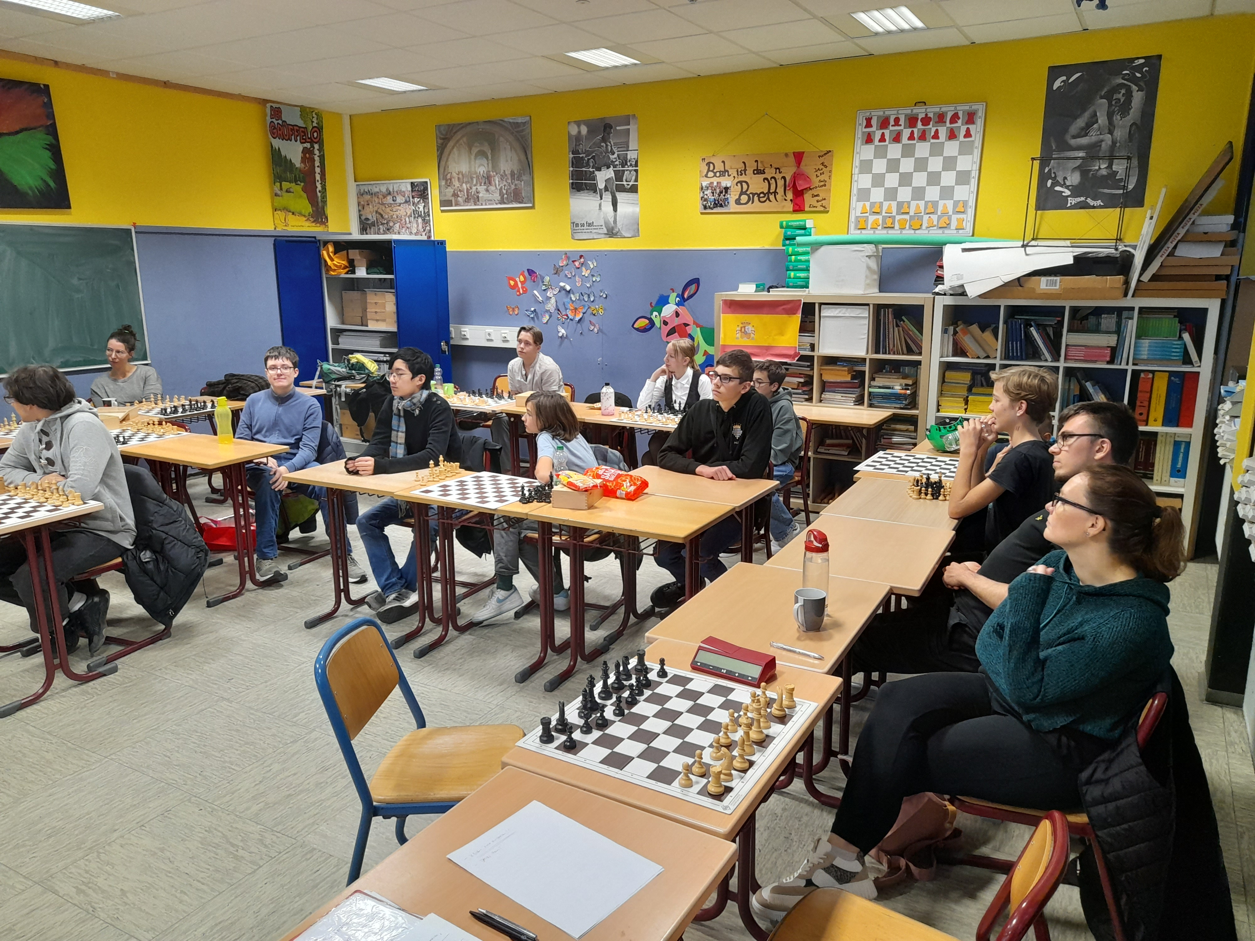 Am verlängerten Wochenende 01. und 02. November fanden sich Teile der Schach-Gemeinschaft des OHG im Schachraum 102 zu einer Fortbildung der Deutschen Schachjugend (DSJ) ein. Die Schülerinnen Larissa Kiencke, Aleksander Majdanski, Mika Kiss, Kilian Kraus, Younes Schalow, Kalani Schmitt, Yusuf Amini, Jonas Sutanto, Kian Koch, Luis Goeder, Tristan Schalow, Alper Burak Öner sowie die Lehrkräfte Lenni Görg, Kai Zelgert und Daniel Schalow wollten das „Schulschachpatent der Deutschen Schachjugend“ erwerben und wurden dazu von Fortbilder Helge Frowein (Grundschule Garching, München) mit den Grundzügen der Schachdidaktik konfrontiert.